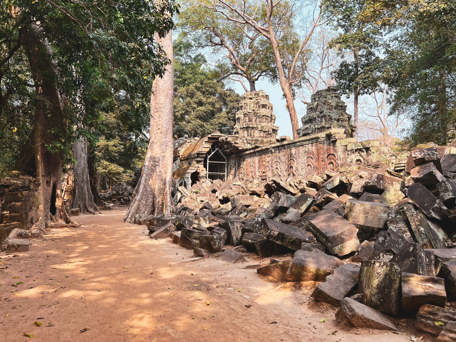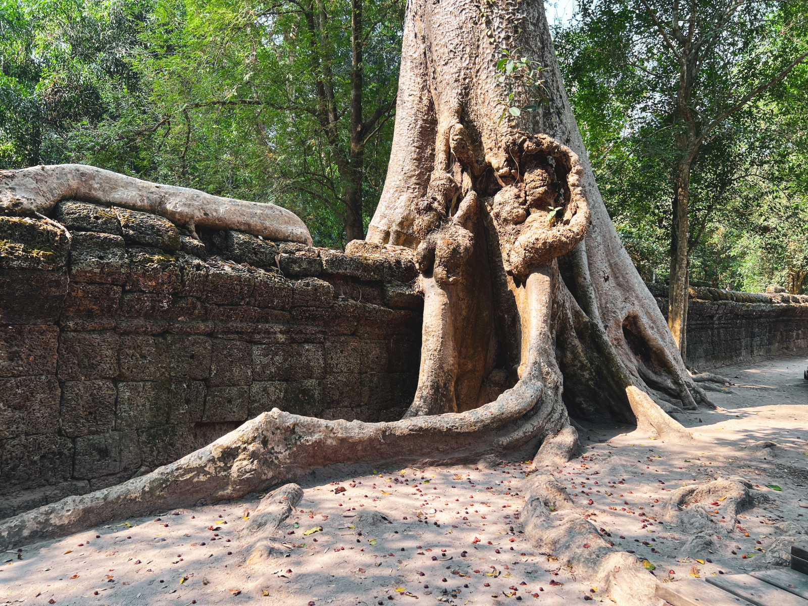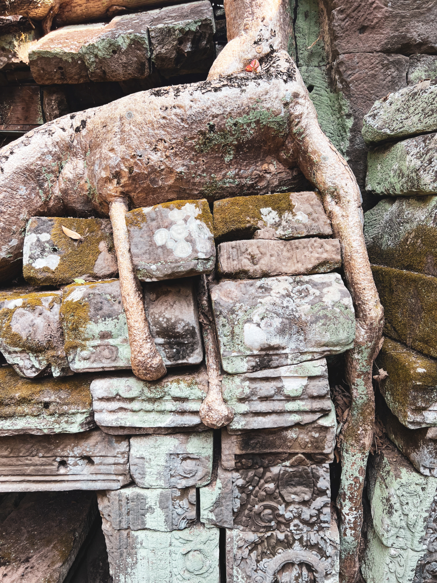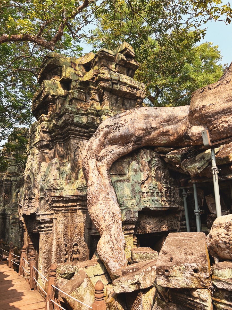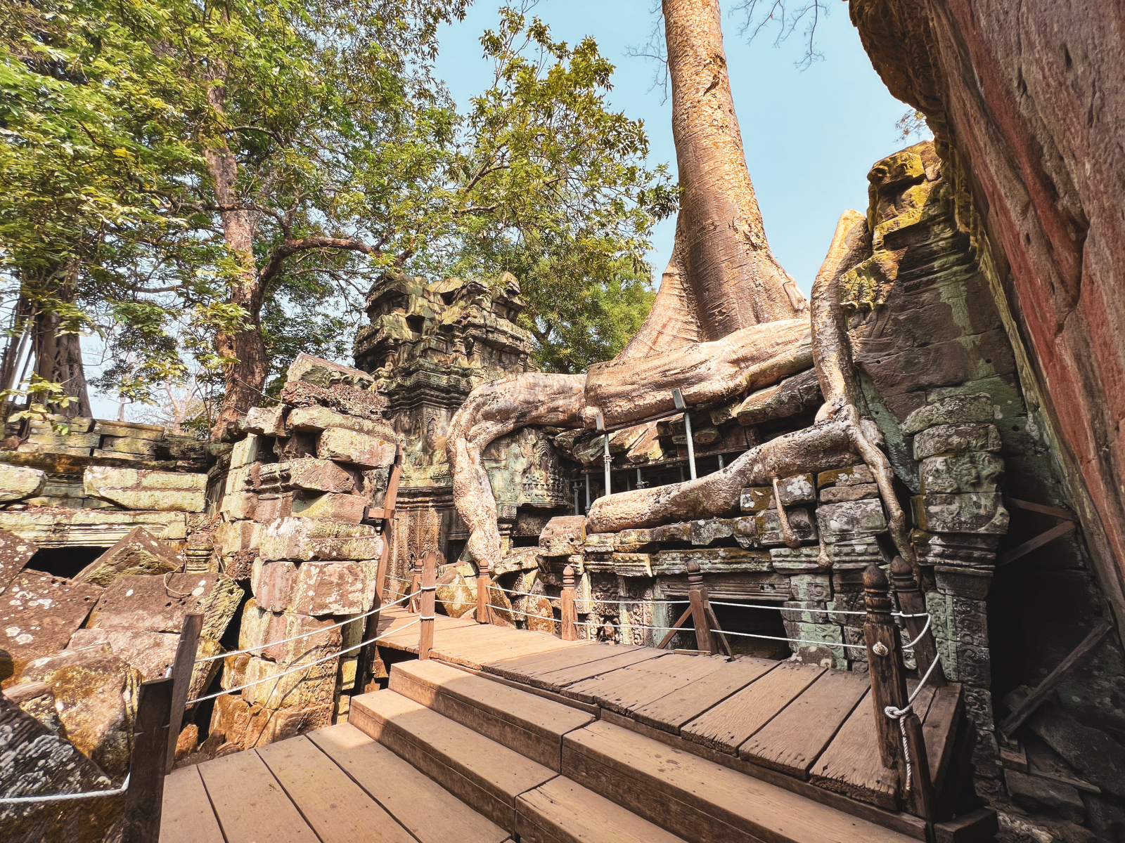 Die eigentliche Magie von Ta Prohm ist Tatsächlich dass die Mauern des Ta Prohm heute zum Großteil verfallen sind. Wurzeln der überwuchernden Bäume zeigen einen einzigartige Symbiose zwischen der unbändigen Kraft und Wildheit der Natur auf.